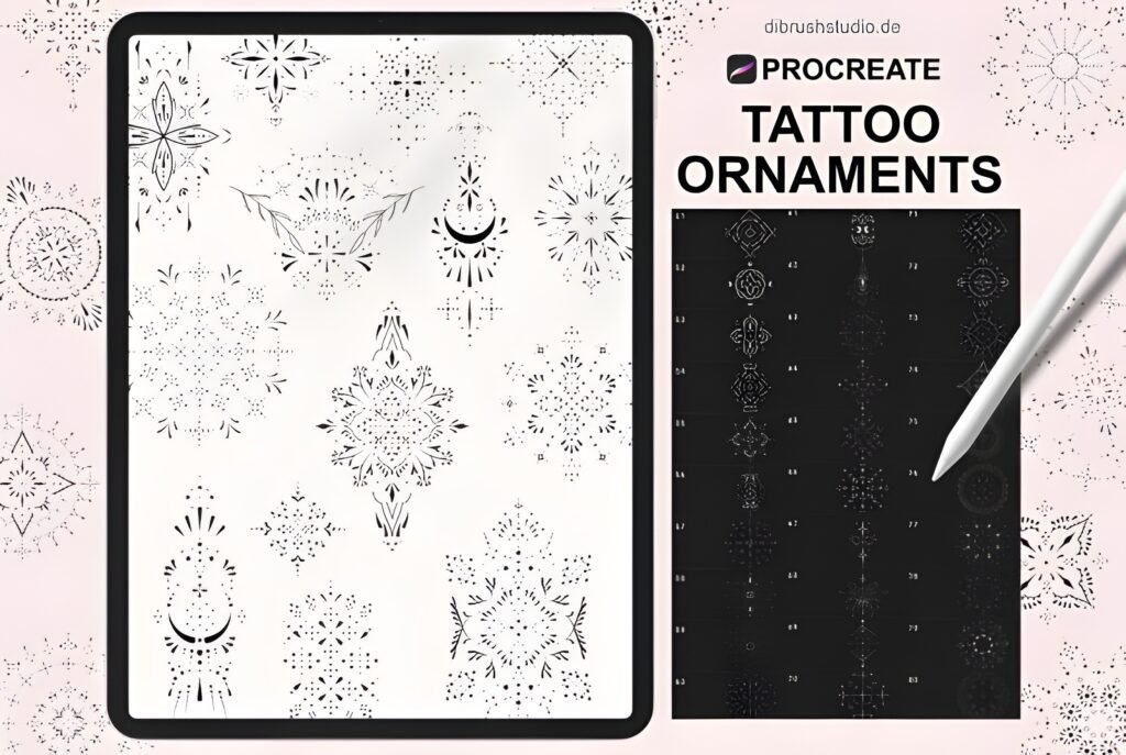 ✒️ Tatto Ornament Stamps — Ornamental Brush Set for Elegant, Professional Tattoo Stencils Transform your artwork with the Tatto Ornament Stamps, a collection of 90 ornamental Procreate brushes designed for artists who want to create clean, detailed, and expressive Tattoo Stencils. Each stamp captures the beauty of traditional ornamentation — flowing curves, geometric accents, mandala‑inspired